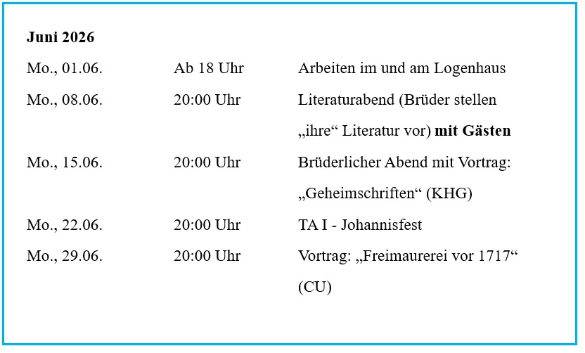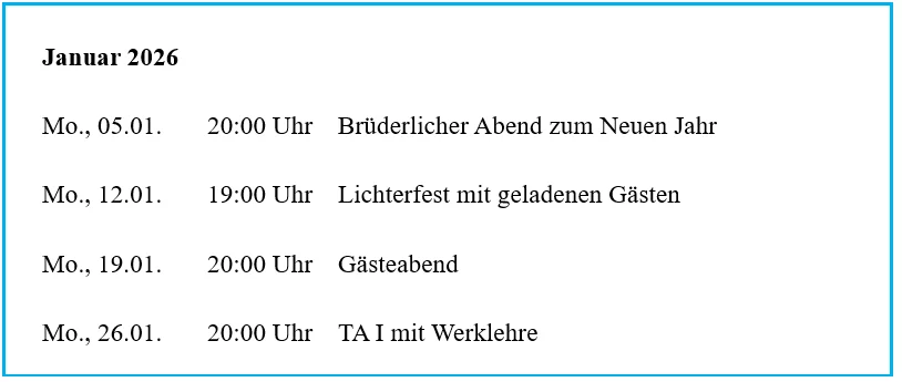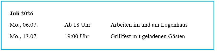 In den Sommerferien (NRW) und an Feiertagen (NRW) finden keine Logenabende statt.