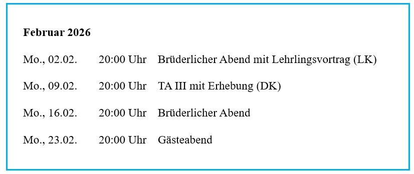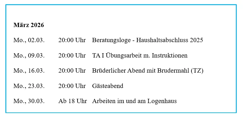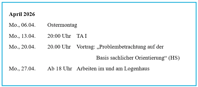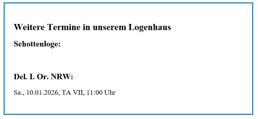 In den Sommerferien (NRW) und an Feiertagen (NRW) finden keine Logenabende statt.